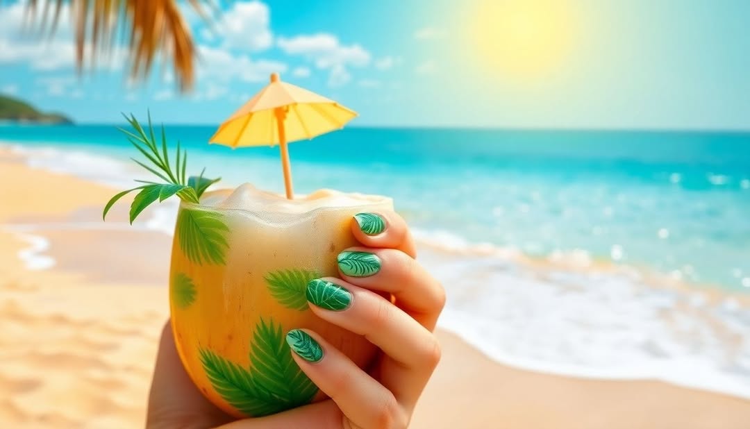 Celebrate the warmth of May with tropical palm leaves. Green palm fronds or monstera leaves on a neutral base will give you a relaxed, vacation-ready vibe. This design works great for beach trips or casual get-togethers.